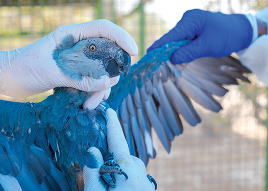 A Spix’s macaw undergoes examination at the breeding center operated by BlueSky Caatinga. (Photo by ICMBio/Miguel Monteiro)