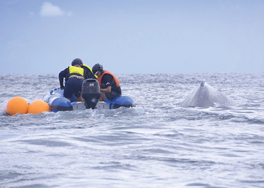 Rescuers disentangle a whale from fishing gear near Puerto Vallarta on Dec. 6. (Photo by Astrid Frisch)